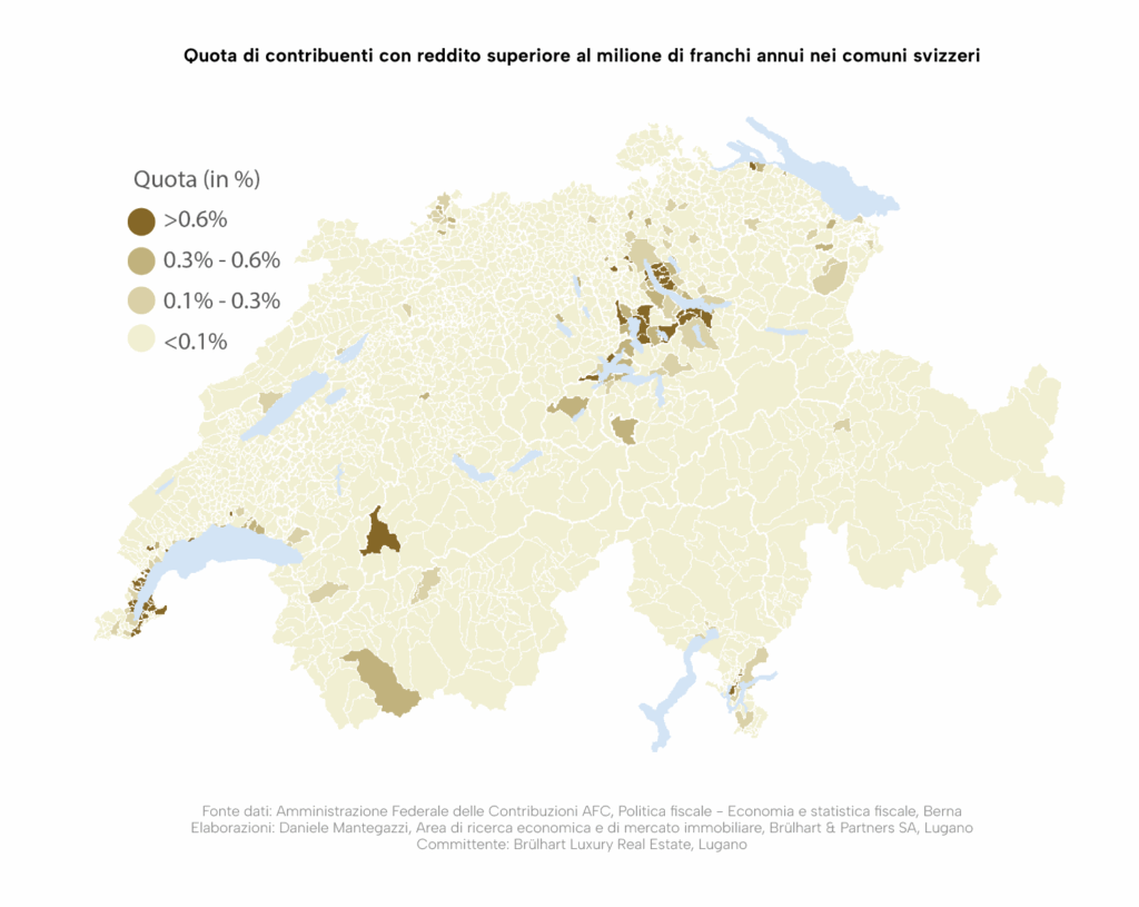 Tuttavia, questa ricchezza non è presente in tutto il territorio elvetico in modo uniforme. All’interno del Paese la concentrazione di contribuenti ad alto reddito e patrimonio varia fortemente da cantone a cantone e da comune a comune. Infatti, come emerge da uno studio commissionato dalla Brülhart Luxury Real Estate e presentato alla conferenza della geografia della ricchezza in Ticino lo scorso 24 settembre presso l’Hotel Splendide Royal Lugano insieme a FGP Swiss & Alps – Forbes Global Properties, Forbes Svizzera e Colombo Wealth SA, la presenza di contribuenti con redditi elevati si concentra principalmente nella Svizzera centrale – nei cantoni di Zugo, Svitto, Nidvaldo, Zurigo e Obvaldo – e nell’area del Lemano – nei cantoni di Ginevra e Vaud.