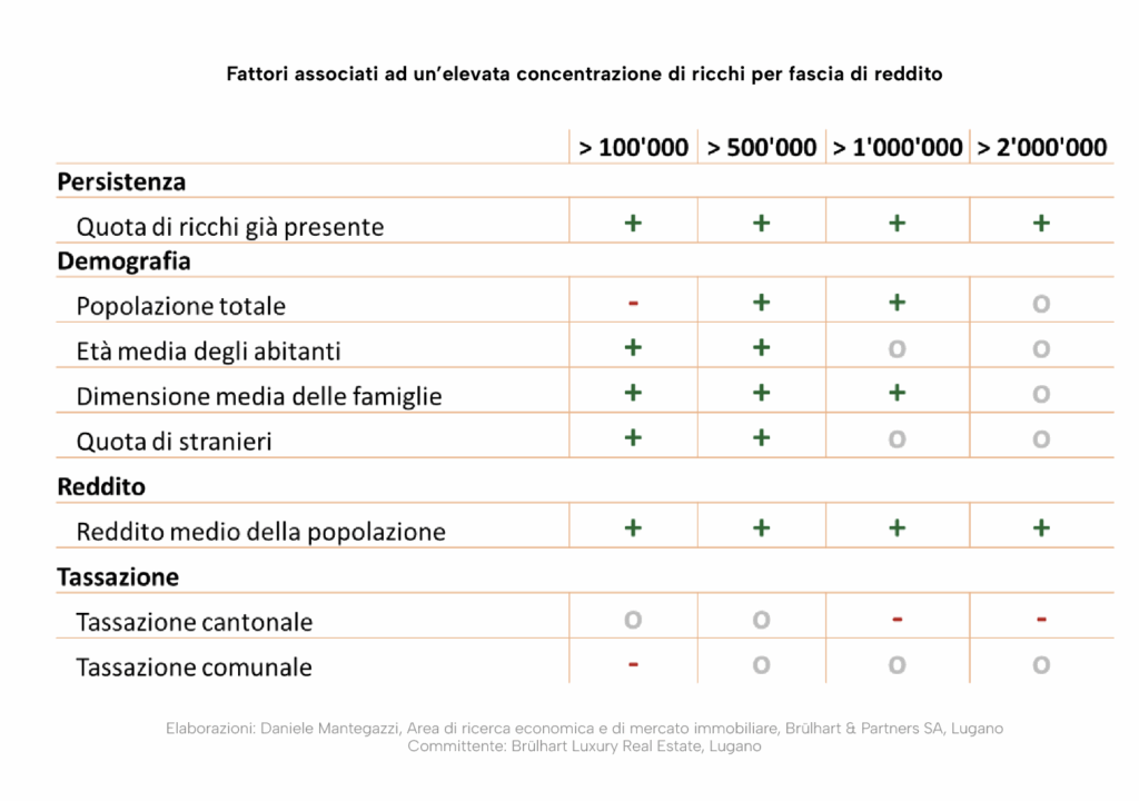 L’analisi dei dati mostra che la ricchezza non si distribuisce in modo casuale. La presenza di contribuenti facoltosi tende ad autoalimentarsi: la ricchezza attira altra ricchezza. Questo effetto di persistenza è particolarmente evidente nelle fasce di reddito più elevate, dove i contribuenti ad alto reddito scelgono di vivere in contesti già caratterizzati da un’elevata concentrazione di benessere economico. Tra gli altri fattori che incidono maggiormente figurano la dimensione e la composizione demografica, l’età media, la quota di residenti stranieri e, naturalmente, il livello di reddito medio locale. Le aree urbane e più internazionali attraggono un numero maggiore di contribuenti facoltosi, grazie alla combinazione di servizi, accessibilità e qualità della vita. Anche l’ambiente fiscale ha un peso rilevante, seppur con effetti differenti a seconda delle fasce di reddito: i contribuenti medio-alti risultano più sensibili alla concorrenza fiscale tra comuni, mentre i redditi più elevati rispondono maggiormente alle differenze di imposizione a livello cantonale. Ciò evidenzia come le decisioni di localizzazione dei contribuenti più abbienti dipendano da valutazioni strategiche su una scala ben più ampia.