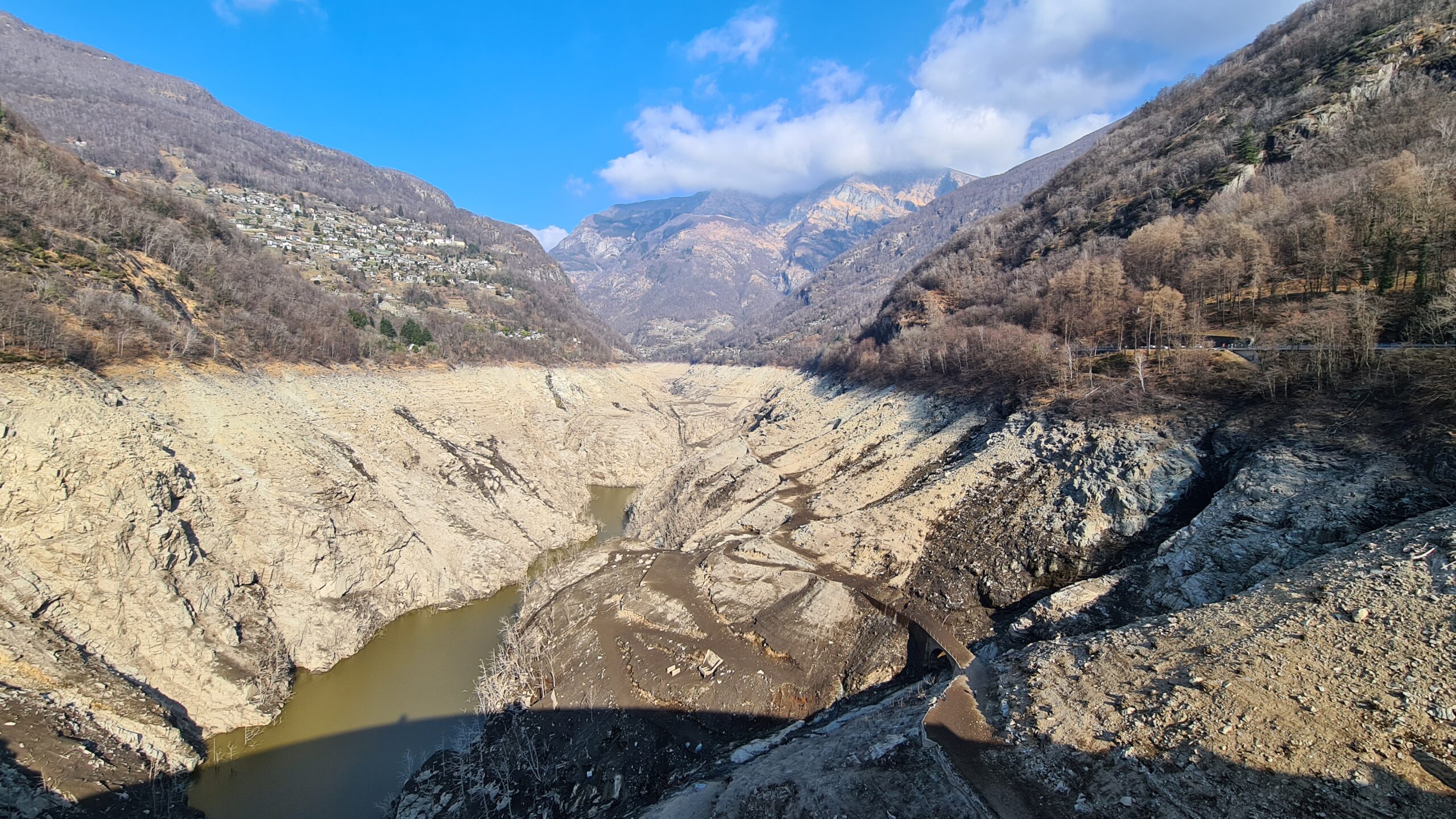 Diga della Verzasca, vuotata per manutenzione nel 2022. Sul fondo si vedono gli alberi perfettamente conservati, in quanto sempre sommersi. L’immagine richiama la carenza idrica di quel periodo, che ha destato non poche preoccupazioni.