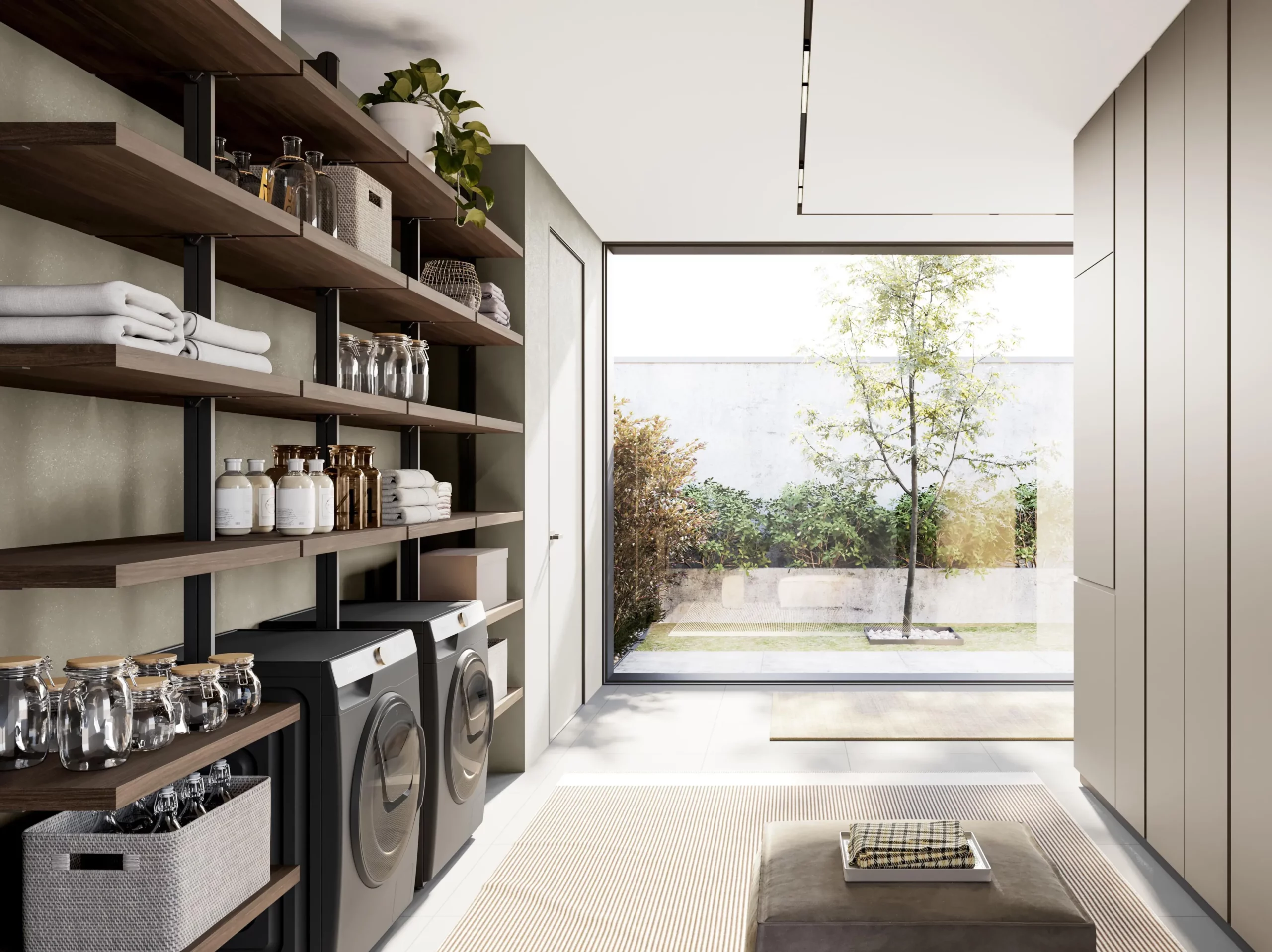 Quando gli spazi sono ridotti e la superficie a pavimento è limitata, la capacità di sfruttare l’estensione verticale della stanza diventa quindi una risorsa preziosa. L’installazione di mensole, scaffalature e barre per appendere oggetti consente infatti di liberare spazio e distribuire il peso degli accessori in modo funzionale, mentre in prossimità della lavatrice, o sopra di essa, si possono sistemare portautensili e armadietti a scomparsa, garantendo un’area di lavoro ordinata e facilmente igienizzabile, aspetto quest’ultimo certamente da non sottovalutare. Le soluzioni modulari, in cui ogni elemento può essere configurato o spostato a seconda delle esigenze del momento, permettono così una gestione dinamica della lavanderia: questo approccio non soltanto valorizza lo spazio verticale, ma favorisce anche la personalizzazione e l’adattabilità dell’ambiente alle necessità della famiglia.