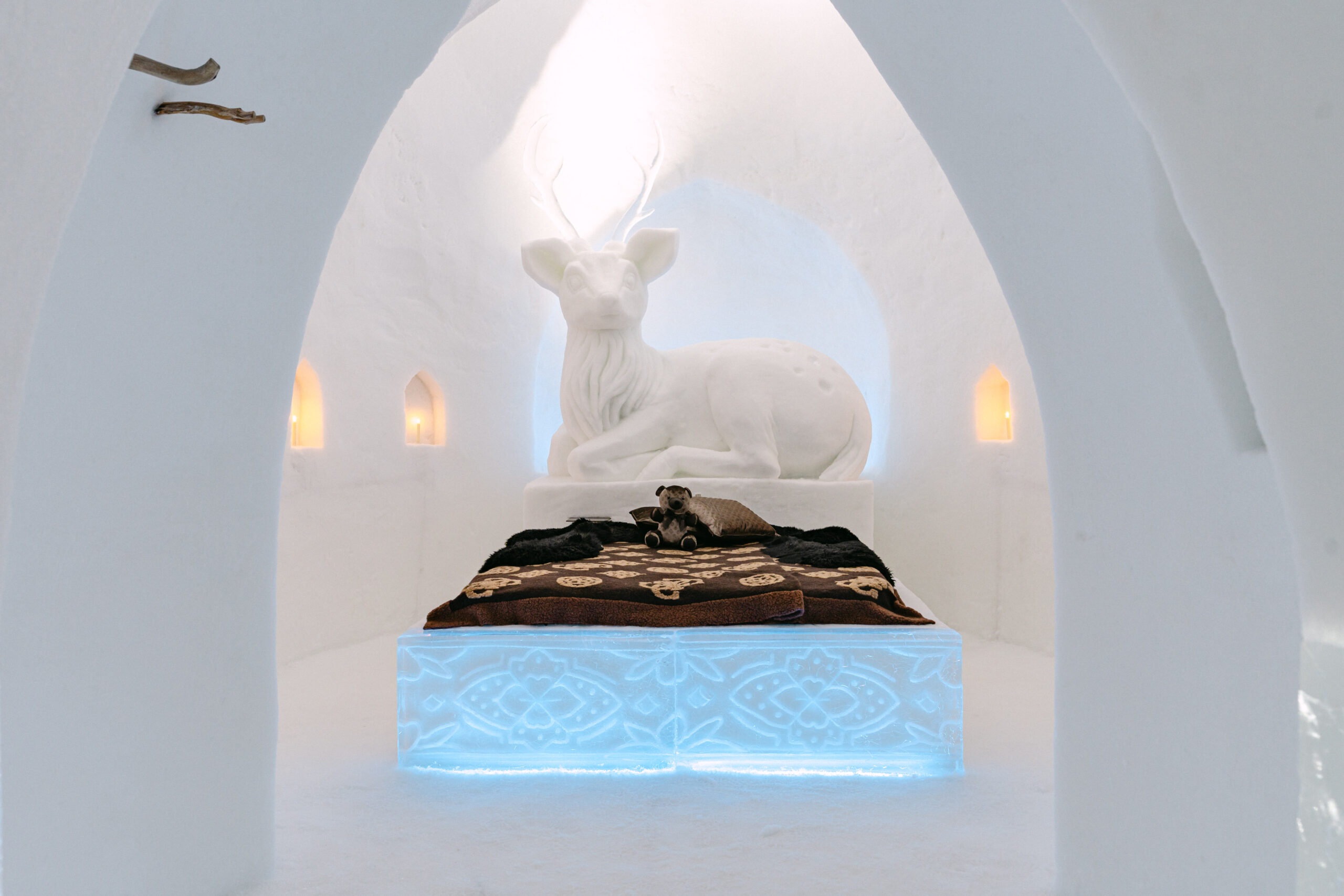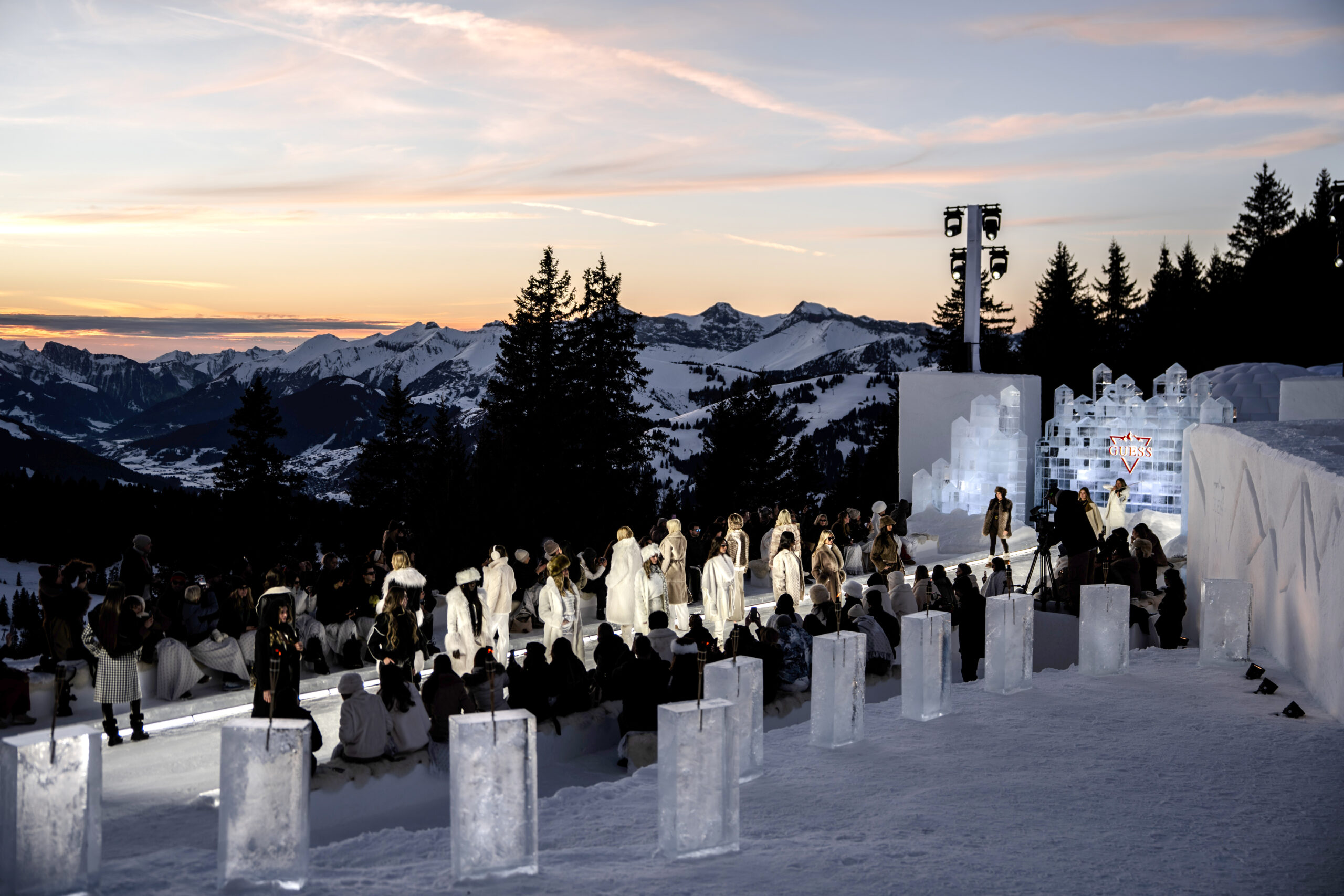 Sfilata GUESS a Gstaad: igloo di neve allestito con accessori coordinati al contesto.