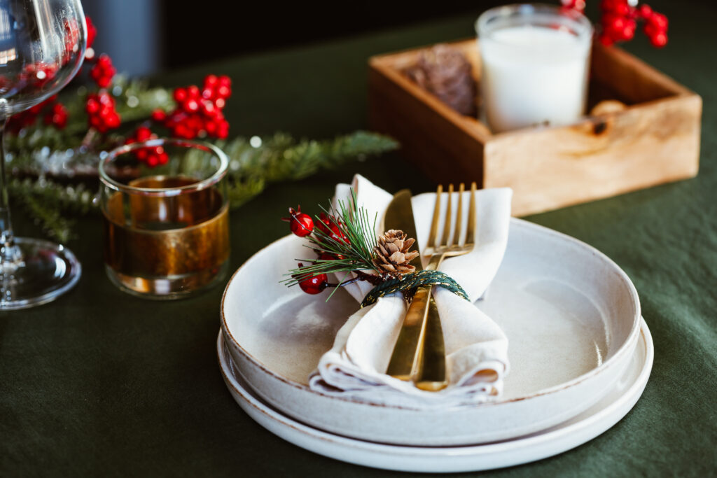 La tavola natalizia è la scenografia che accoglie ospiti e famiglia: una mise en place curata comunica attenzione e calore. Quest’anno le tendenze prediligono tonalità naturali (lino grezzo, verde bosco e dettagli dorati) che evocano l’atmosfera di un Natale autentico ma raffinato. Tovaglia e tovaglioli in tessuti naturali, impreziositi da un segnaposto artigianale come una pigna dorata o un rametto di rosmarino legato con spago, piatti bianchi con sottopiatti in vetro o metallo spazzolato, centrotavola basso con rami di abete e candele di diverse altezze: sono dettagli che trasformano la tavola in un ambiente scenografico ma intimo.