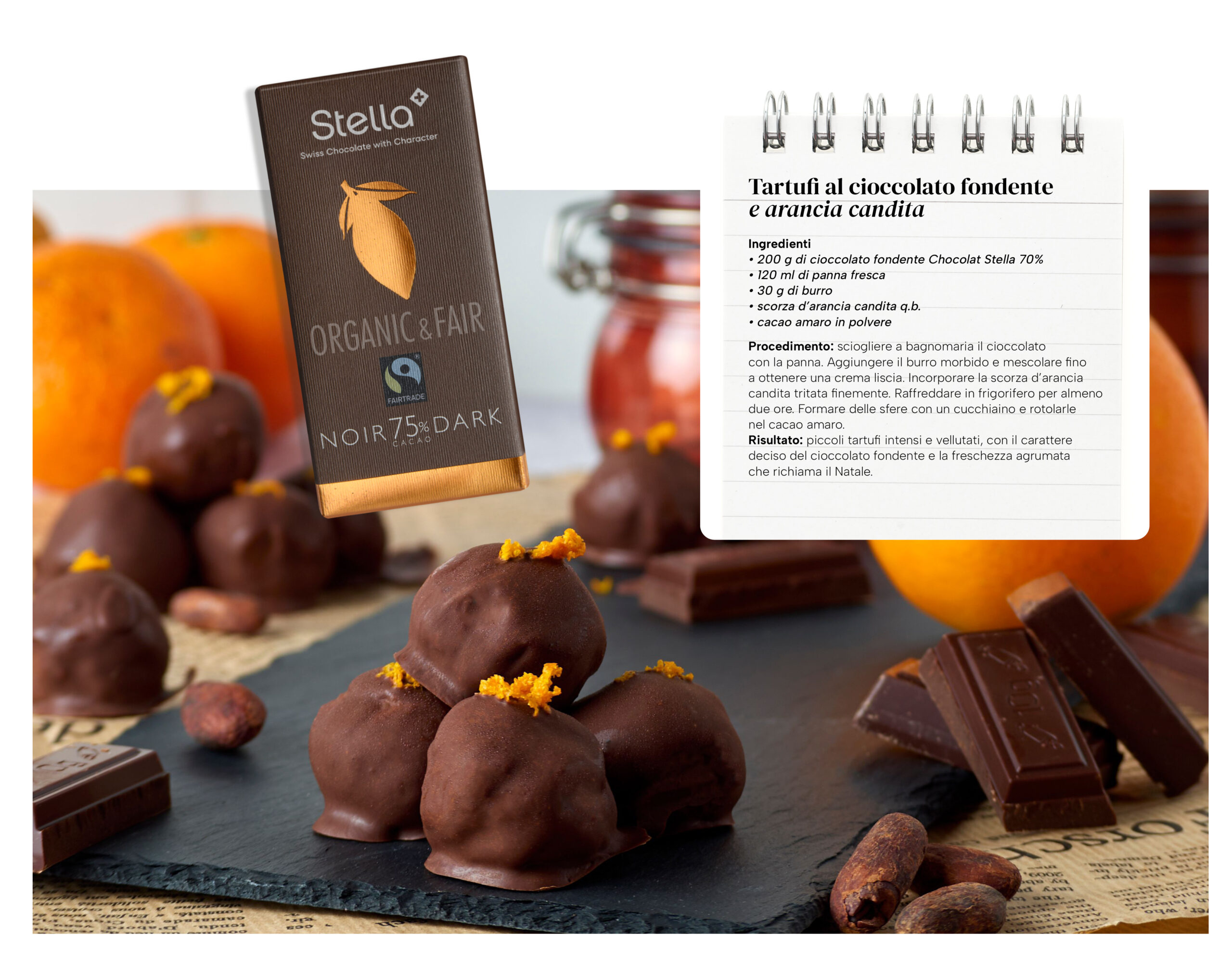 Il menu deve bilanciare tradizione e innovazione. L’antipasto ideale è rappresentato da capesante scottate con crema di topinambur e chips di cavolo nero, piatto elegante e leggero che apre con note marine equilibrate da toni vegetali. Il primo piatto celebra la tradizione locale con ravioli fatti a mano ripieni di brasato al Merlot ticinese, serviti con riduzione al vino rosso e scaglie di formaggio d’alpe. Per il secondo si propone un filetto di cervo arrosto con salsa ai mirtilli rossi, accompagnato da purea di castagne e verdure invernali glassate, un classico delle feste presentato con essenzialità contemporanea. Nel cuore delle feste non può mancare il dessert di cioccolato e Chocolat Stella di Giubiasco celebra la tradizione Svizzera con proposte di eccellenza. Per un tocco natalizio suggeriamo i tartufi al cioccolato fondente e arancia candita. L’impiattamento è la firma visiva di ogni piatto: piatti ampi e neutri che fanno risaltare le cromie, disposizione asimmetrica per creare movimento, salse stese con pennellate leggere o piccoli punti decorativi, evitando eccessi. La coerenza tra estetica e gusto rafforza l’esperienza conviviale. Un Natale perfetto è fatto di dettagli: la luce delle candele, il profumo dei piatti, la dolcezza che chiude la cena. Il menu proposto crea un equilibrio tra raffinatezza e accoglienza, trasformando ogni portata in un momento di condivisione e ricordo.